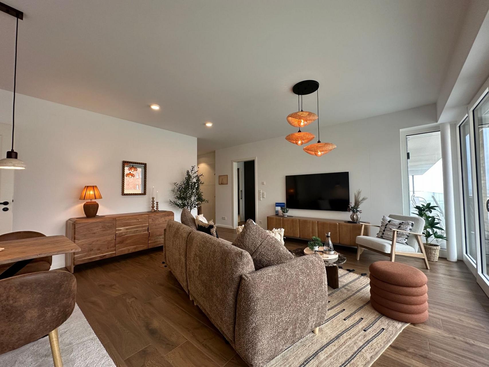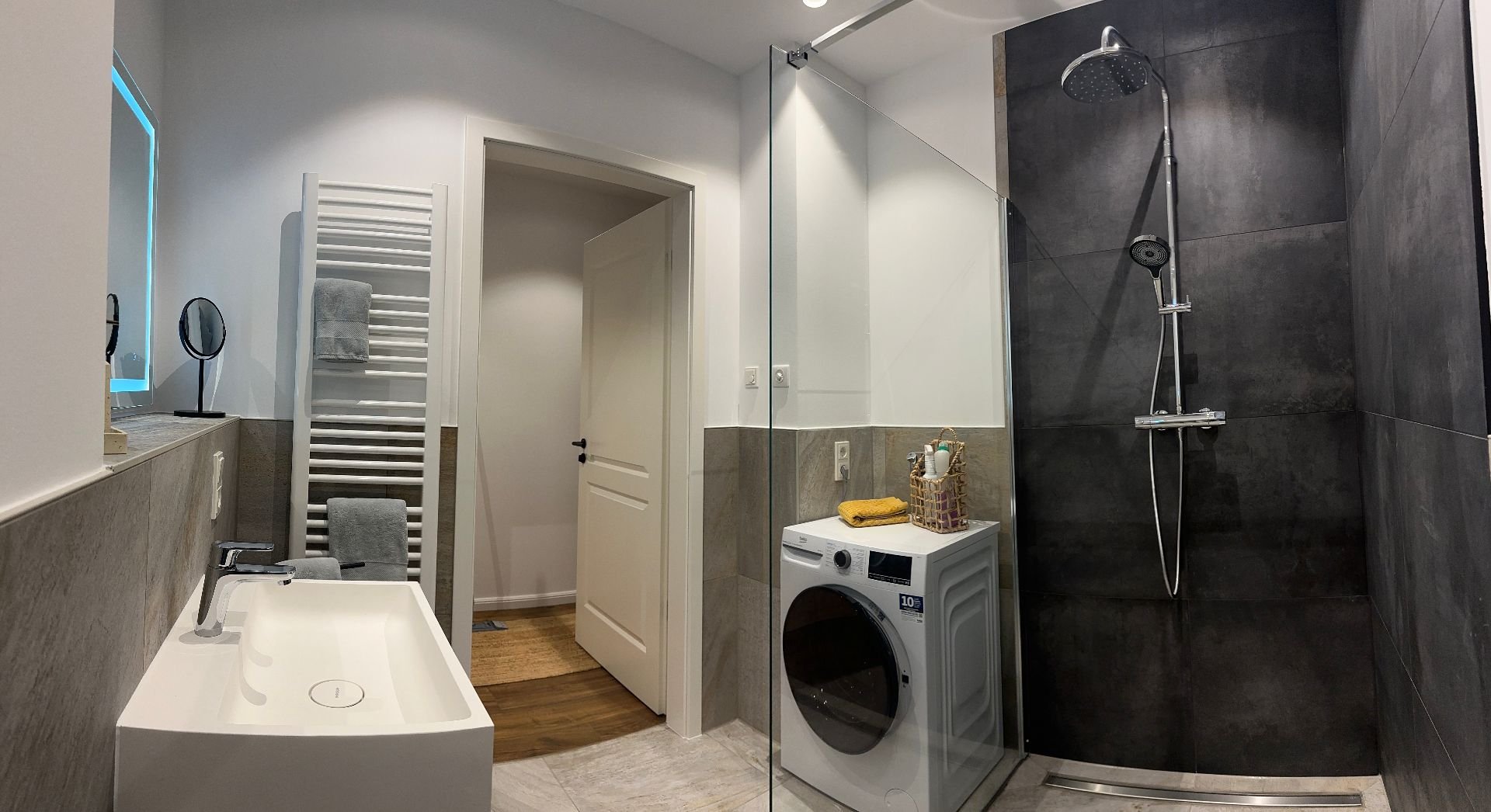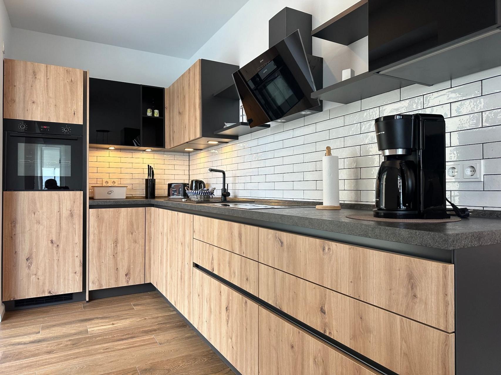 Die Ferienwohnung besticht durch hochwertige Ausstattung: Zwei komfortable Schlafzimmer mit Doppelbetten, modernem 55-Zoll-Flachbild-TV und viel Stauraum bieten Ruhe und Entspannung. Zwei luxuriöse Duschbäder mit bodengleicher Regendusche, Handtuchheizung und praktischem Waschtrockner sorgen für höchsten Komfort  ideal auch für längere Aufenthalte in Cuxhaven. Die komplett ausgestattete Einbauküche mit Ceranfeld, Backofen, Kühlschrank samt Gefrierfach sowie Pad- und Filterkaffeemaschine lädt zum gemeinsamen Kochen ein. Im gemütlichen Wohnbereich erwarten Sie ein 65-Zoll-Flachbild-TV, Sofa und Sessel für entspannte Stunden.